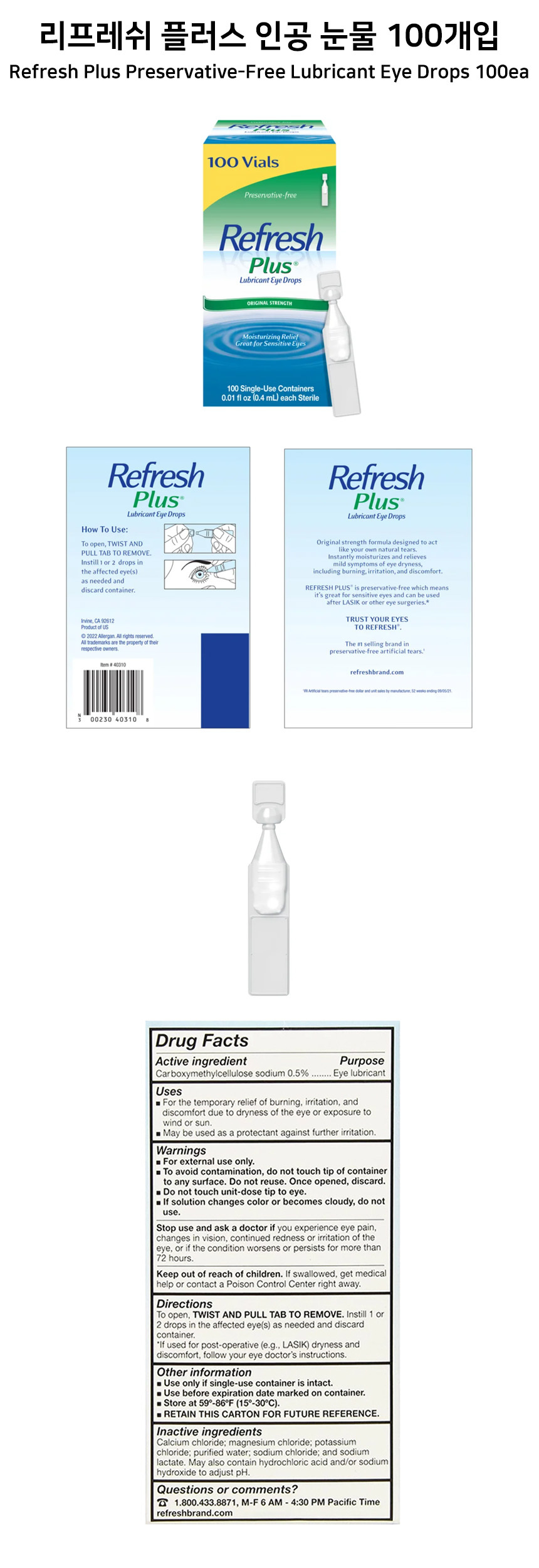 이 상품에 관한 리뷰를 작성하고 있습니다:리프레쉬 플러스 인공 눈물 100개입 Refresh Plus Preservative-Free Lubricant Eye Drops 100ea
