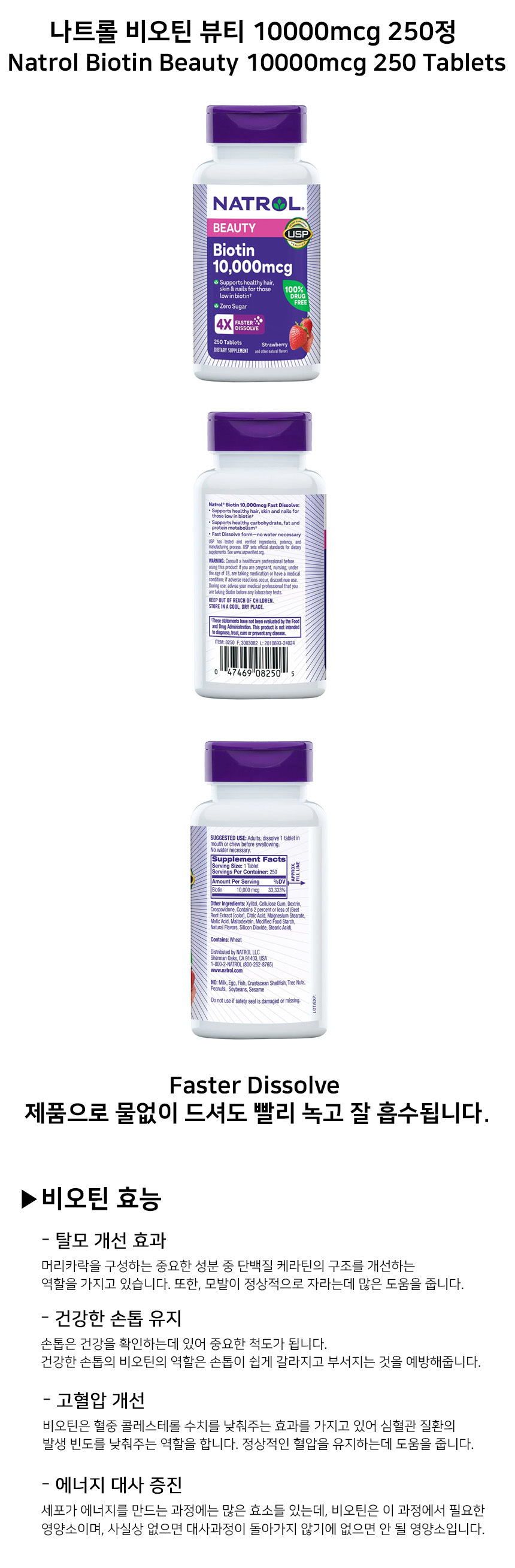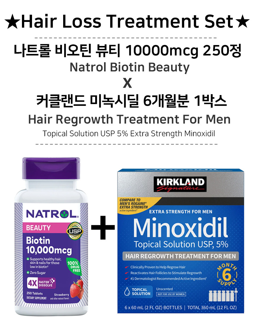 이 상품에 관한 리뷰를 작성하고 있습니다:[Hair Loss Treatment Set] 탈모세트 나트롤 비오틴 뷰티 10000mcg 250정 + 커클랜드 미녹시딜 6개월분 1박스 세트 Natrol Biotin Beauty 250 tablets & Kirkland Hair Regrowth treatment 5% extra Strength Minoxidil for men 6months