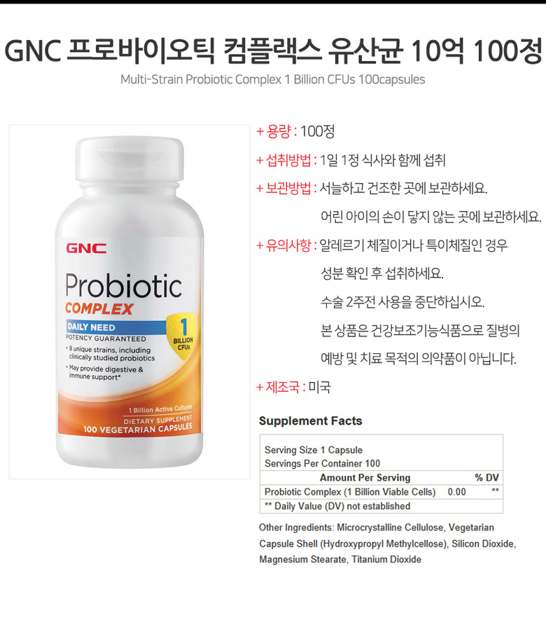 [GNC] 프로바이오틱 10억 100정 Probiotic Complex 1Billion CFUS 100capsules