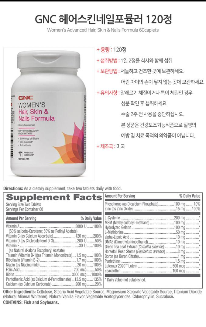이 상품에 관한 리뷰를 작성하고 있습니다:[GNC] 여성용 헤어, 스킨&네일 포뮬러 120정 Women's Hair,Skin & Nails Formula 120tablets
